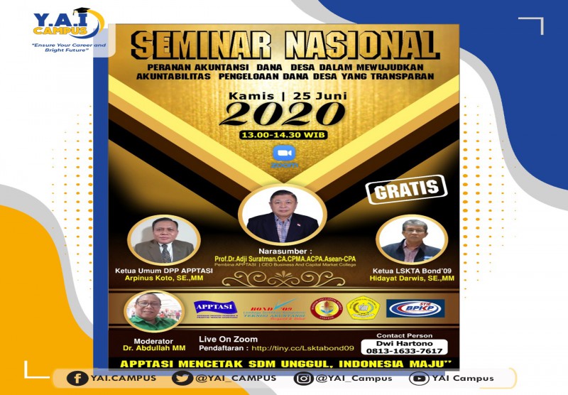 Sekolah Tinggi Ilmu Ekonomi Y.A.I akan melaksanakan kegiatan Webinar Nasional dengan materi "Peranan Akuntansi Dana Desa dalam Mewujudkan Akuntabilitas Pengolaan Dana Desa yang Transparan", yang akan di laksanakan pada :